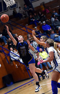 Dodd City sophomore Gracyn Sindler soars for a bank shot.