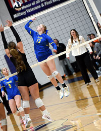 Leonard freshman Leah Stoy crushes a kill from the corner as the Lady Tigers upset the No. 3 team in Class 3A.