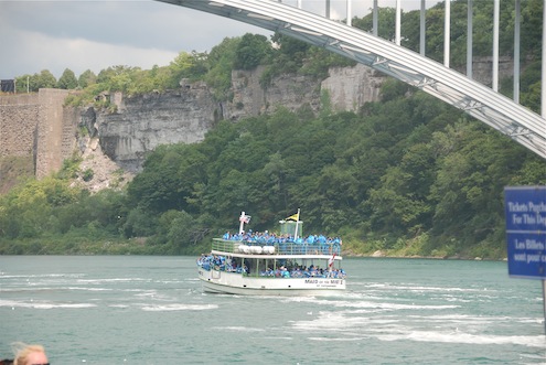 Whenever you see a photo of the Falls, you see a little boat with everyone decked out in a blue slicker, photo-snapping away and trying their best not to get drenched. Our tickets were included in the tour and we fell in line, amusement park days recalled, and snaked our way for thirty minutes to the loading dock. There, we were handed our “slicker”, a lightweight plastic affair which everyone had troubling getting into because the wind was blowing and it was so lightweight. That said, it kept you dry and I managed to bring mine home. There’s just nothing like a souvenir that won’t squash down but that can be used to hold breakables in your suitcase.