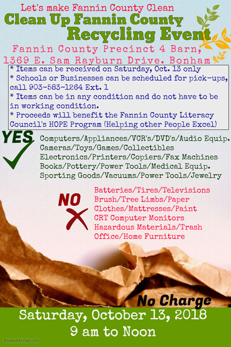 The Fannin Literacy Council is sponsoring their annual FREE RECYCLING event during Great Days of Service on Saturday, October 13. The event will be held at the Fannin County Precinct 4 Barn located at 1369 East Sam Rayburn Drive in Bonham from 9:00 a.m. to noon. Your donations will help ensure proper recycling and save valuable landfill space.