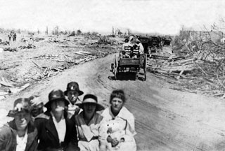 In a very effective manner it combines vintage photos with audiotaped statements from survivors and music of the era. For example, you can hear Myrtle Cain reminiscing that her family did not make it to a neighbor’s storm cellar because her husband insisted on taking the time to close all the windows and blow out their kerosene lamps. They had to lie down in a ditch, and Myrtle suffered a broken leg. You can see numerous old photos that document the devastated homes, autos and farm equipment damaged by the cyclone.