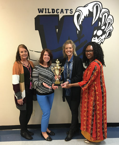 Stuff the Bus 2019 Trophy - (L-R) State and Federal Programs Director Karol Ackley, Elementary Ed Director Jennifer Ray, Paris Junior High School Principal Kristi Callihan, and Secondary Ed Director Jerrica Liggins.