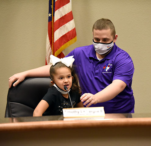 The regular meeting followed at 5:30 p.m. with councilmembers Bill Chapman, Tony Rodriguez, Timothy La Vergne, Kevin Hayes and Wayne Moore in attendance and Bonham Mayor Pro Tem H. Compton presiding in the absence of Bonham Mayor Roy Floyd. The meeting began with an invocation given by Teagan La Vergne, the seven-year-old daughter of Bonham City Councilmember Timothy La Vergne.