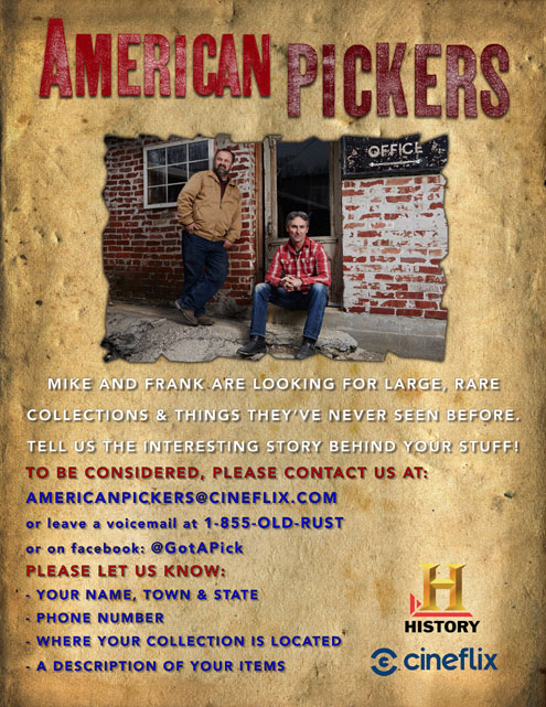 American Pickers is looking for leads and would love to explore your hidden treasure. If you or someone you know has a large, private collection or accumulation of antiques that the Pickers can spend the better part of the day looking through, send us your name, phone number, location and description of the collection with photos to: americanpickers@cineflix.com or call 855-OLD-RUST. facebook: @GotAPick