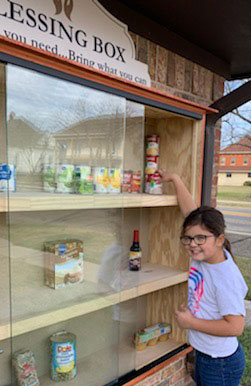 Main Street session member, Tammy Whitlock, is in charge of monitoring the Blessing Box. She and her grandchildren Kamy and Aidyn were the first to place items in the box, shortly after Carl and Lanny had completed the mounting of the box on Saturday.