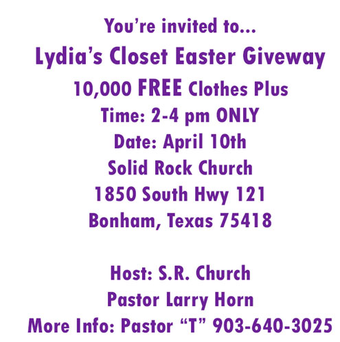 Lydia's Closet Easter Giveaway April 10 at Solid Rock Church in Bonham
