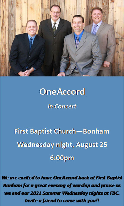 We are excited to have OneAccord back at First Baptist Bonham for a great evening of worship and praise as we end our 2021 Summer Wednesday nights at FBC. Invite a friend to come with you!