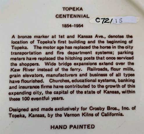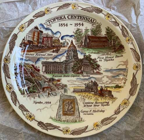 The more colorful plate for the Topeka, Kansas, centennial celebration (1854 – 1954) features brown and yellow leaves and flowers encircling vivid depictions of Topeka’s culture: Kansas Avenue in 1888, the first home built in Topeka, the State Capitol building, the city from above in 1954, a combine harvester going over a wheat field, and the Cyrus K. Holliday memorial (he founded the city of Topeka).