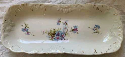 The one unmarked piece in our displayed collection was difficult to trace. Based on its shape, we determined that it was some sort of celery, relish, or asparagus dish. However, we didn’t have much else to go on without any maker’s markings. Our volunteer, Susan, helped my research along when she discovered very similar plates using the keyword “Victorian.” The term “Victorian” refers to an era defined by the reign of Queen Victoria of the British Empire from 1837 – 1901. But again, without anything on our plate to indicate a date or manufacturer, the usage of the term “Victorian” to describe this plate may not be accurate even though some people online are using the term to describe plates almost exactly the same as the one on display.