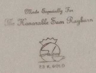 The wheat pattern on this china is called “Joci” or “Royal Joci.” Our version of this china is very special, as some pieces say, “Made Especially For The Honorable Sam Rayburn,” on the back.