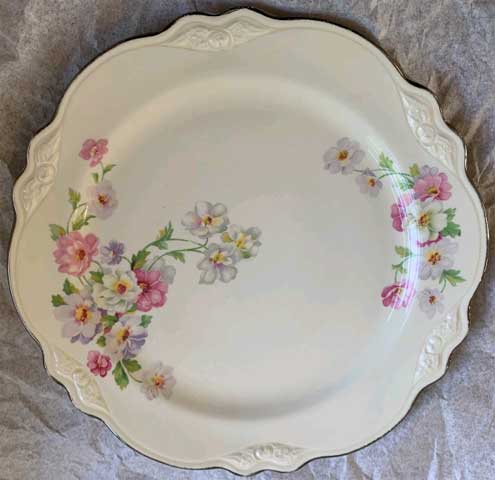 A Solian Ware cake plate made in the early 1900s brings us to a distinctive area of England. Soho Pottery Co., Ltd. in Cobridge, England, made earthenware pottery and functioned from 1910 – 1944. Operated by members of the Simpson family, the owners changed the name from