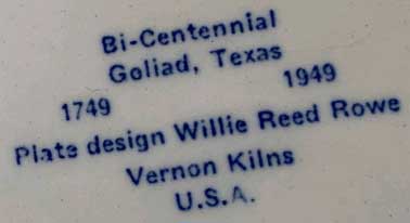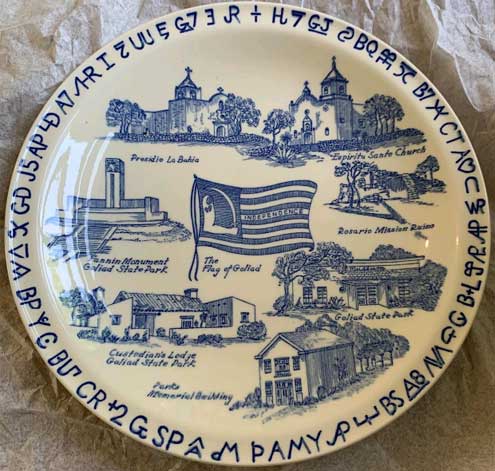 Willie Reed Rowe designed a commemorative plate to celebrate 200 years of Goliad, Texas (1749 – 1949). Cattle brands on the edge of the plate encircle images of Goliad: Presidio la Bahía, Espiritu Santo Church, Rosario Mission Ruins, the flag of Goliad, and the buildings of Goliad State Park including the Fannin Monument, Custodian’s Lodge, the Parks Memorial Building, and the main building.