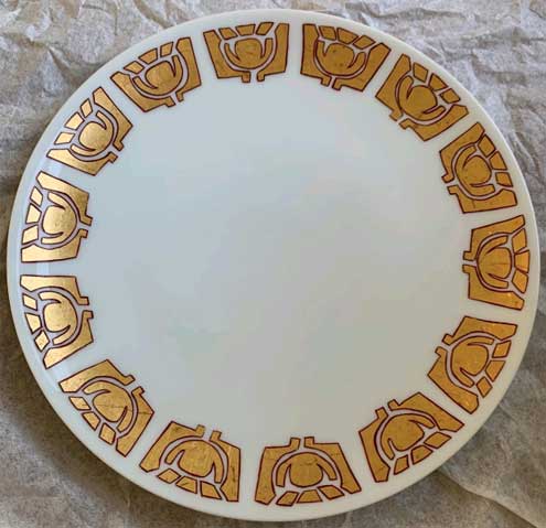 Based on the backstamp, this white plate with a repetitive golden symbol all around the front was likely produced between 1908 – 1939. In contrast with the other overtly floral plates in our collection, this plate appears to have more of an abstract version of a flower, or perhaps some