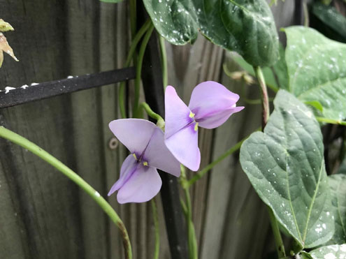 When I began growing long beans, I was gob smacked by the rapid development and growth of the beans. From flowers to beans it is only a matter of days before they are ready to harvest. Typically, two lavender flowers bloom side by side and produce two tiny bean threads. This couplet of beans grows quickly, elongating a few inches a day, plumping out to produce the 12-20” long Red Noodle Bean.