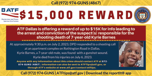 Dallas, Texas — The Bureau of Alcohol, Tobacco, Firearms and Explosives announces a reward of up to $15,000 for information leading to the arrest and conviction of the suspect(s) responsible for the death of 7-year-old Kyrie Barnes.