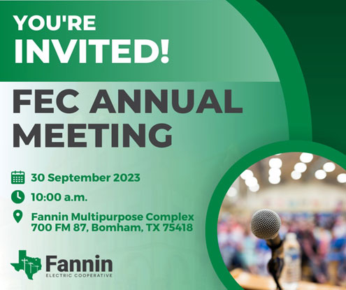 Fannin County, Texas -- You’re invited to celebrate Fannin Electric Cooperative’s rebrand, as well as receive updates from leadership at the FEC annual meeting. The meeting will be at 10:00 a.m. Saturday, September 30 at Fannin County Multipurpose Complex, 700 FM 87, Boham, TX 75418.