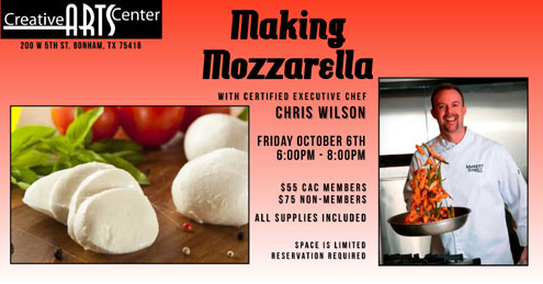 Bonham, Texas -- Have you ever thought about how cheese is made? Have you ever wanted to make your own? Now’s your chance! Certified Executive Chef, Corporate Chef, and Director of Culinary Innovation for one of the Largest Supermarket chains in the country, Chris Wilson, invites you along with the Creative Arts Center to join in interactive and hands on classes in the Culinary Arts!