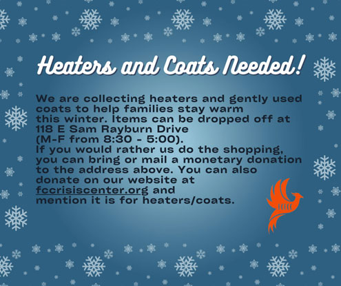 Fannin County, Texas -- Fannin County Family Crisis Center is ready to start collecting heaters and coats! Please make sure that coats are clean before dropping them off. Thank you!