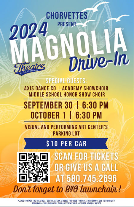 Durant, Okla. – The Southeastern Oklahoma State University Chorvettes’ fifth annual "Magnolia Drive-In" performances are scheduled for Monday, September 30, and Tuesday, October 1, in the parking lot of the Visual and Performing Arts Center.