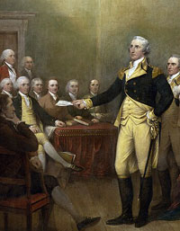 1783 – George Washington resigns as commander-in-chief of the Continental Army at the Maryland State House in Annapolis, Maryland. George Washington's resignation as commander-in-chief marked the end of Washington's military service in the American Revolutionary War and his return to civilian life at Mount Vernon. His voluntary action has been described as "one of the nation's great acts of statesmanship" and helped establish the precedent of civilian control of the military. After the Treaty of Paris ending the war had been signed on September 3, 1783, and after the last British troops left New York City on November 25, Washington resigned his commission as commander-in-chief of the Continental Army to the Congress of the Confederation, then meeting in the Maryland State House at Annapolis, Maryland, on December 23 of the same year. This followed his farewell to the Continental Army, November 2 at Rockingham near Princeton, New Jersey, and his farewell to his officers, December 4 at Fraunces Tavern in New York City. Later, in describing his painting, General George Washington Resigning His Commission, American artist Trumbull considered Washington's resignation "one of the highest moral lessons ever given to the world." The historian Thomas Fleming described the significance of the event: "This was – is – the most important moment in American history."