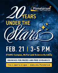 We’re excited to celebrate the East Texas A&M Planetarium’s 20th anniversary on February 21 from 3:00–5:00 p.m. at the McFarland Science Building! The event will feature planetarium demos, interactive stations, free giveaways and more than $4,000 in prize drawings, including telescopes and other big-ticket items.
