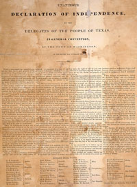 1836 – Texas Revolution: The Declaration of independence of the Republic of Texas from Mexico is adopted. The Texas Declaration of Independence, adopted on March 2, 1836 at the Convention of 1836 in Washington-on-the-Brazos, formally declared Texas's independence from Mexico during the Texas Revolution. It was signed by delegates the following day after corrections were made to the text. In October 1835, native Tejanos and new settlers in Mexican Texas launched the Texas Revolution. However, amongst the people of Texas, many struggled with understanding what the ultimate goal of the Revolution was. Some believed that the main goal should be total independence from Mexico, while others sought for a reimplementation of the Mexican Constitution of 1824 which had included freedoms, such as the treatment of slaves as property, that were not in the 1835 constitution of Mexico, Siete Leyes. (Seven Laws) To find a compromise, a convention was called for in March 1 of 1836. This convention differed from the previous Texas councils of 1832, 1833, and the 1835 Consultation. Many delegates were young U.S. citizens who had recently arrived in Texas, by violating Mexico’s April 1830 immigration ban. Moreover, many of them had fought in battles during the Texas Revolution against Mexico in 1835. Of the 60 signers, only two were native Texans, Jose Francisco Ruiz and Jose Antonio Navarro. Most of the delegates were members of the War Party and were adamant that Texas must declare its independence from Mexico. The convention was convened on March 1 with Richard Ellis as president. The delegates selected a committee of five to draft a declaration of independence; this committee was led by George Childress along with Edward Conrad, James Gaines, Bailey Hardeman, and Collin McKinney. The committee submitted its draft within a mere 24 hours, and this led historians to speculate that Childress had written much of it before he arrived at the Convention. The document closely mirrors the United States Declaration of Independence in both structure and tone. The declaration was approved on March 2 with no debate. Based primarily on the writings of John Locke and Thomas Jefferson, the declaration proclaimed that the Mexican government "ceased to protect the lives, liberty, and property of the people, from whom its legitimate powers are derived" and alleged that it committed "arbitrary acts of oppression and tyranny." The declaration officially established the Republic of Texas, although it was not officially recognized at that time by any government other than itself. The Mexican Republic still claimed the land and considered the delegates to be invaders, and the United States didn't recognize it since that would be an act of war against Mexico. The declaration's adoption was followed by the Battle of the Alamo and ultimately the decisive Texian victory at the Battle of San Jacinto in April 1836.