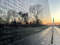 1982 – The Vietnam Veterans Memorial is dedicated in Washington, D.C. after a march to its site by thousands of Vietnam War veterans. The Vietnam Veterans Memorial, commonly called the Vietnam Memorial, is a U.S. national memorial in Washington, D.C., honoring service members of the U.S. armed forces who served in the Vietnam War. The two-acre site is dominated by two black granite walls engraved with the names of those service members who died or remain missing as a result of their service in Vietnam and South East Asia during the war. The Memorial Wall was designed by American architect Maya Lin and is an example of minimalist architecture.[2] The Wall, completed in 1982, has since been supplemented with the statue Three Soldiers in 1984 and the Vietnam Women's Memorial in 1993. The memorial is in Constitution Gardens, adjacent to the National Mall and just northeast of the Lincoln Memorial. It is maintained by the National Park Service and receives around three million visitors each year. It was initially controversial for its lack of heroic ornamentation and iconography, but its reputation improved over time. In 2007, it was ranked tenth on the "List of America's Favorite Architecture" by the American Institute of Architects. As a national memorial, it is listed on the National Register of Historic Places.