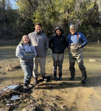 On a cool morning along the West Fork of the Trinity River, NRI researchers waded carefully through flowing water to check a series of mussel silos submerged along the riverbed. These silos, concrete domes with a central opening that houses juvenile mussels and allows water to flow through, are a part of a project examining how water quality influences mussel growth and survival. The field team is led by research associate Rachel Carpenter and supported by Dr. Charles Randklev, research scientist and head of NRI’s freshwater mussel program.