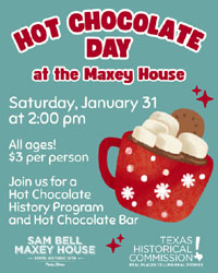 Families and history enthusiasts are invited to warm up this winter on Hot Chocolate Day at the Sam Bell Maxey House State Historic Site on Saturday, January 31, at 2:00 p.m. Guests will enjoy a cup of cocoa from a hot chocolate bar while learning about the history of this beloved beverage. The program offers a cozy and engaging way to spend a winter afternoon. The program fee is $3 per participant. After the program, visitors are encouraged to stay for a tour of the historic Maxey House to discover the story of one of Paris’s most distinguished families and gain insight into daily life in 19th-century Texas. Regular admission fees apply for tours.