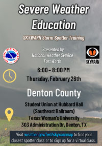 The 2026 spring severe weather season is not too far away, and the National Weather Service and local public safety officials want you to be ready. The National Weather Service (NWS) Office located in Fort Worth will be conducting a free Severe Weather Education class in Denton County on Thursday, February 26, 2026, from 6:00 p.m. to 8:00 p.m. at the Texas Women’s University Student Union at Hubbard Hall (Southeast Ballroom) in Denton. There is no cost to attend this class, no pre-registration is required, and you do not have to be a resident of Denton County to attend.