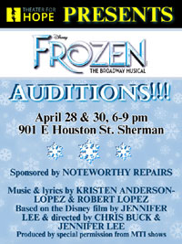 Theater For Hope’s spring play, Sarah, Plain and Tall, has brought many families acting and performing together to tell this endearing and heart-felt Newberry Award-winning book by Patricia MacLachlan and adapted into a play by Joseph Robinette. In June, the next show for Theater For Hope is the musical Frozen and auditions will be April 27 and 28 from 6:00 to 9:00 p.m.