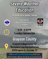 The 2026 spring severe weather season is not too far away, and the National Weather Service and local public safety officials want you to be ready. The National Weather Service (NWS) Office located in Fort Worth will be conducting a free Severe Weather Education class in Grayson County on Tuesday, February 10, 2026, from 6:00 p.m. to 8:00 p.m. at the Grayson College Center for Workplace Learning Auditorium in Denison. There is no cost to attend this class, no pre-registration is required, and you do not have to be a resident of Grayson County to attend.