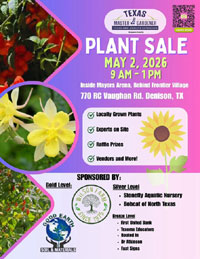 Mark your calendars! Join the Texas Master Gardeners – Grayson County for our annual Plant Sale on May 2, 2026, from 9:00 a.m. – 1:00 p.m. The plant sale will be held inside Mayors Arena, behind Frontier Village, 770 RC Vaughan Rd., Denison, TX.