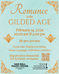The Sam Bell Maxey House State Historic Site will celebrate Valentine’s Day with a special guided tour, “Romance in the Gilded Age”, on Saturday, February 14, at 10:00 a.m. and 2:00 p.m. This Valentine’s-themed tour explores the romantic lives of the Maxey and Long families and offers visitors a glimpse into courtship during the late 19th century.