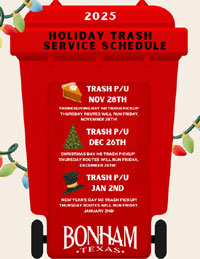 The City of Bonham's contracted waste management provider will NOT be running trash routes on Thanksgiving Day (Thursday, November 27). All City of Bonham residents who have Thursday Trash Service will have their trash picked up on Friday, November 28.