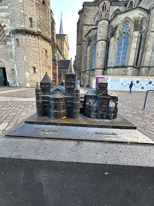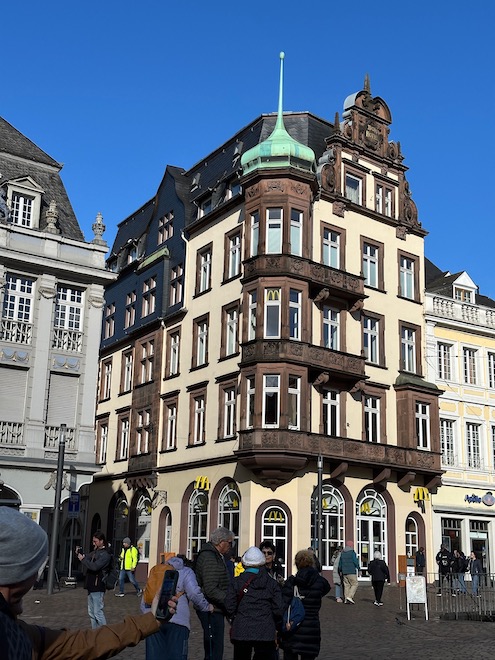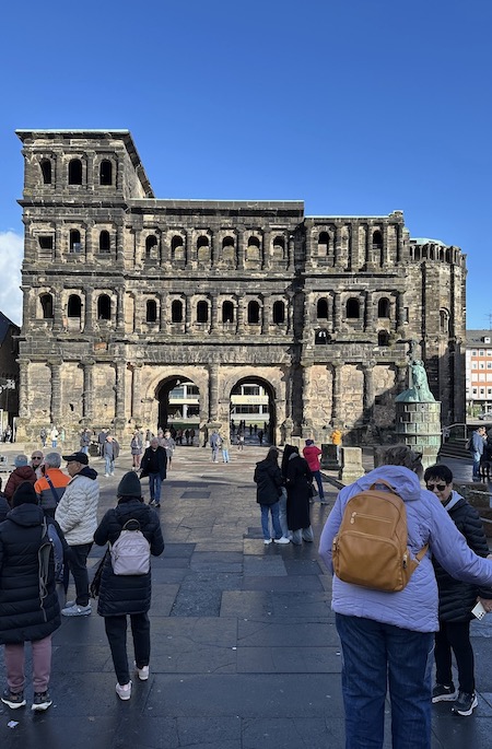 The ship didn’t move that night in Cochem, but early the next morning we did. There were damaged locks ahead so we took bus tours. First stop was Trier, Germany’s oldest city, originally a Celtic settlement. In 16 BC, the Romans conquered it, and it later became the “Rome of the North.” An important base for the Romans, it has many UNESCO World Heritage designations with Roman structures still standing, including the Porta Negra City Gate. After lunch on our own (don’t laugh, burgers and chili, with a very nice German wine served by the winemaker), we boarded another bus and journeyed to Bernkastel, a charming city of half-timbered houses where we had a wine tasting.