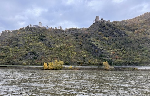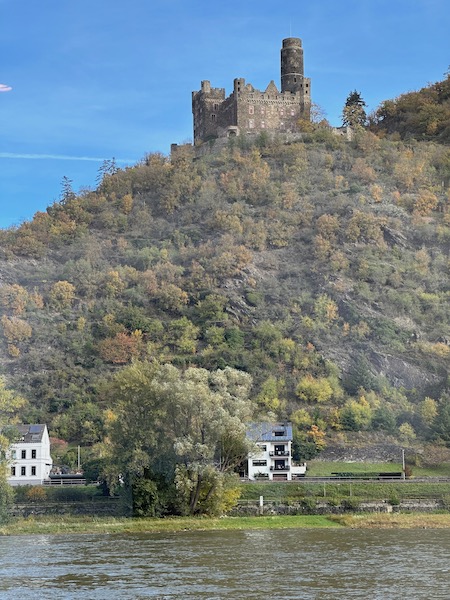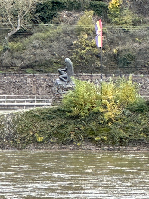 Then, finally—castle day! It wasn’t like we hadn’t had wonderful scenery along the rivers, but today was the day to turn your head from side to side, seeing a new (well, okay, old) castle/fortification. These weren’t the fairy tale Cinderella castles we think of when we think of German castles, but castles they were. Some of them levied customs to ships passing on the river. Others guarded themselves from encroaching entities. Two saw brother set against brother over the love of a woman. In the middle of these thirty castles would be the Lorelei Rock, an imposing 433-foot steep slate rock. It honors the story of the Loreley, a siren who would lure sailors to their death. On the right bank of Rhine is a statue to her and a visitor’s center on the cliff top above.