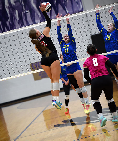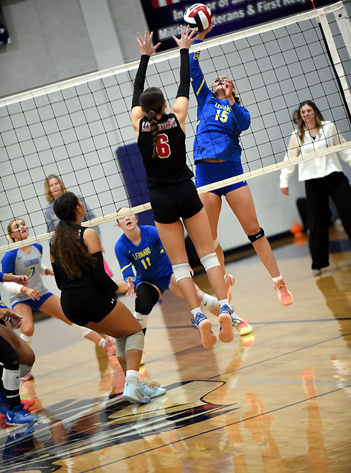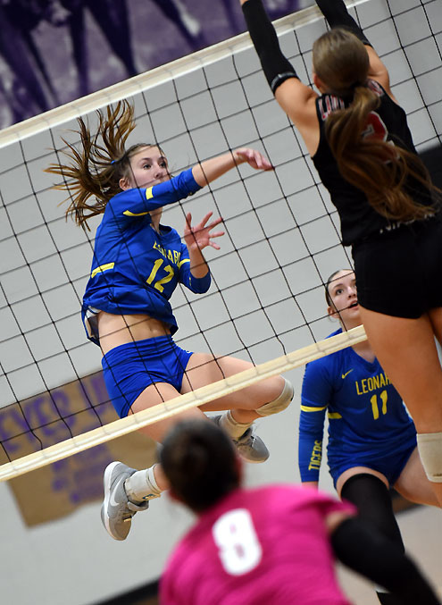 In the first set, Leonard hitters Leah Stoy, Riley Brown and Bella Neaville gave Leonard a 24-20 lead and a block by Neaville put a 25-20 win in the books.