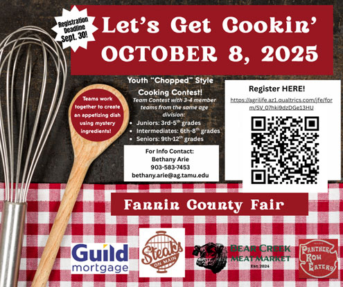 Fannin County, Texas -- Texas A&M AgriLife Extension Service of Fannin County will be hosting the 4th Annual Let’s Get Cookin! youth cooking competition on Wednesday, October 8.