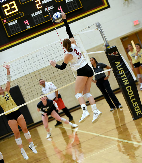 It was a balanced effort for Austin College, with 12 players recording at least one kill while 22 players got into the match. Selah Coleman led the way with six kills and zero attacking errors for a hitting percentage of .667, while Rachel Sadler added five kills in the win. Coleman chipped in seven digs and Sadler had six, as well as a pair of aces. Victoria Larson and Caroline Smith each had four kills, while Laynie Kovacs paced the 'Roos defensively with 15 digs and Madisin Hartsfield had four total blocks, including two solo blocks. Madison Manning led the 'Roos with 14 assists. Kovacs had a team-high three aces in the win.