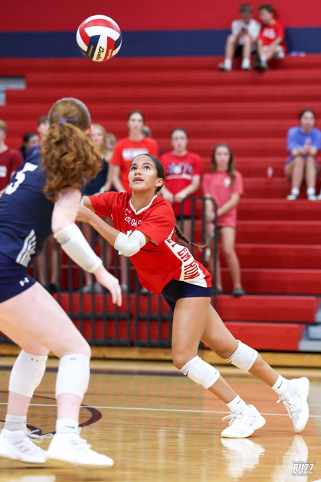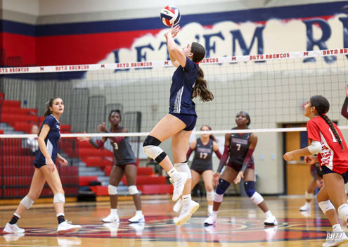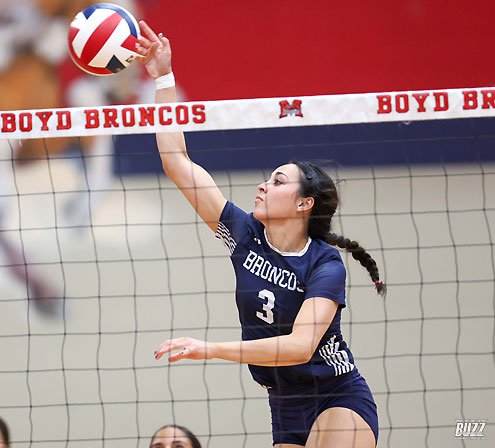McKinney Boyd's Sophia Lane (3) sends the ball over the net against Princeton on Friday, September 26, 2025 at McKinney Boyd High School.