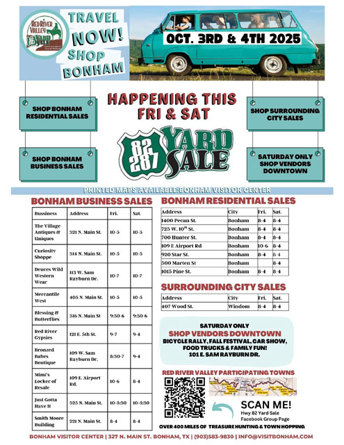 Online interactive map available https://maphub.net/VisitBonham/oct.-3rd-4th-hwy-82-yard-sale