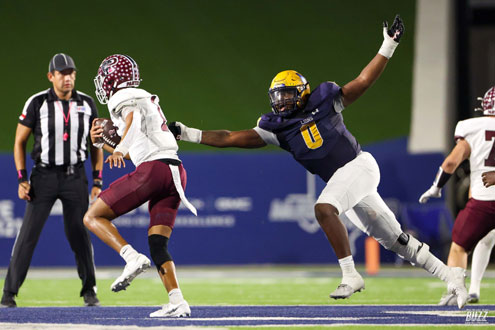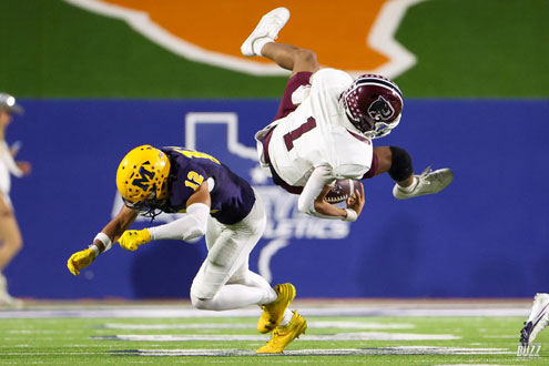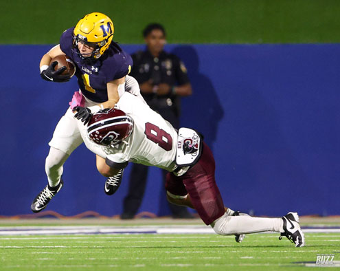 McKinney High Gavin Menefee (1) is hit by Princeton's Brenin Painter (8) on Friday, October 3, 2025 at McKinney ISD Stadium. Princeton won the game 30-21.