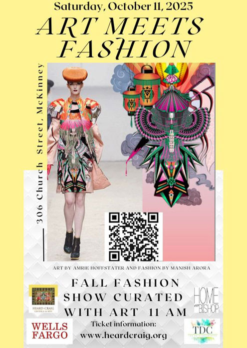 McKinney, Texas -- Feel like you're walking down the runway... Art Meets Fashion is coming to McKinney on October 11, 2025 at 11:00 a.m. in the Church Street Auditorium. This curated fashion show is a preservation fundraiser so you'll have the highest confidence that your attendance will go to a good cause. Tickets on sale now and GROUP tickets are also available. www.heardcraig.org