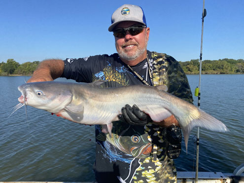 I’m recently off a red-hot trip with Lake Tawakoni catfish guide Tony Pennebaker and we found the blues to be right on schedule. We didn’t catch any trophy fish, Tony knows Ole’ Luke much prefers catching a good ‘mess’ of eater size blues than trophy hunting for trophy class catfish but when one has a fresh bait in the water at Tawakoni, it’s always possible to connect with a big fish. I’ll tell you about the trip in a bit but first, a bit of information on blue catfish seasonal patterns.
