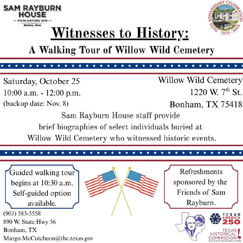 Bonham, Texas -- As a celebration of America’s upcoming 250th birthday, hear the stories of those who lived through it during “Witnesses to History: A Walking Tour of Willow Wild Cemetery” on October 25, 2025, from 10:00 a.m. to 12:00 p.m. at Willow Wild Cemetery located at 1220 West 7th Street in Bonham, TX.