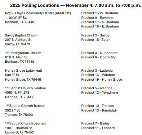 Fannin County operates under a precinct-based system, which means that you must vote at the polling location assigned to your precinct on Election Day. This is especially critical in the upcoming November 4 election, because several precincts have been combined into 7 polling locations. If you go to the wrong polling site, you may be sent to a different location, or depending on the time, asked to cast a provisional ballot which will then be subject to review by the Early Voting Ballot Board to determine whether it can be counted. To help avoid that uncertainty, please double-check your exact polling place before heading out on Election Day, November 4.