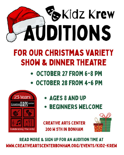 Bonham, Texas -- Kidz Krew is having an open call for auditions for their Christmas show. Kidz Krew is the children’s theatre program at the Creative Arts Center in Bonham.