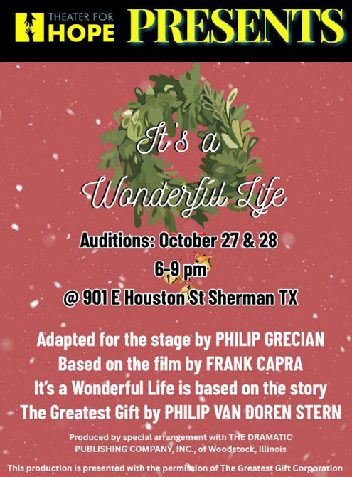 Sherman, Texas -- Webster Crocker, director of Theater For Hope, is looking for a cast for their latest play, It's a Wonderful Life December 18, 19, 20 at Hope on Houston. This show is sponsored by John and Debbie Markl.