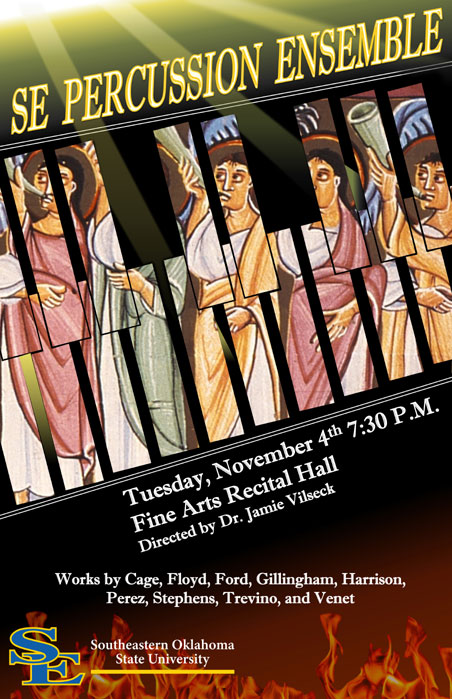 Durant, Okla. – The Southeastern Oklahoma State University Department of Performing Arts will present the Southeastern Percussion Ensemble on Tuesday, November 4, 2025, at 7:30 p.m. in the Fine Arts Building Recital Hall. Admission is free and open to the public.
